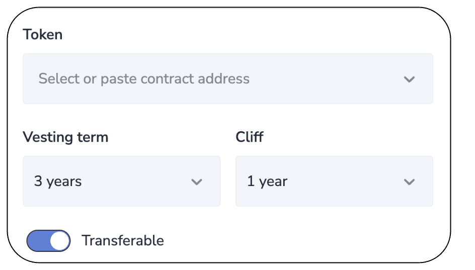Hedgey's contracts allow for totally customizable schedules across all products. Additionally, users can add cliff dates, post vesting lockups, transferability, voting rights, and other core features specific to each product.